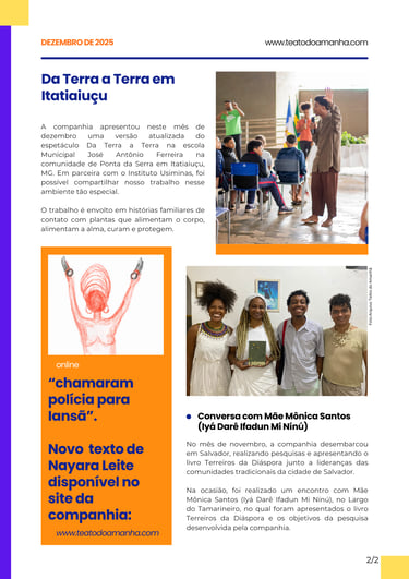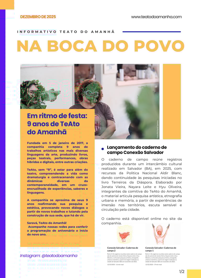 O Informativo TeAto do Amanhã: Na Boca do Povo nasce como um espaço de encontro e partilha. A cada edição, apresentamos um panorama das ações, pesquisas e criações que movimentam o trabalho da companhia em diálogo com os territórios, saberes tradicionais e práticas artísticas. Ao reunir relatos, processos e registros de nossas vivências, buscamos fortalecer redes, aproximar o público de nossos trabalhos e dar visibilidade às histórias e experiências que inspiram nossas obras.