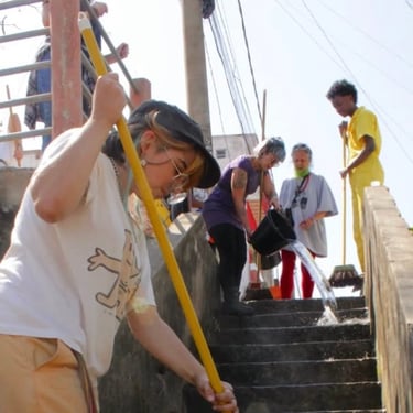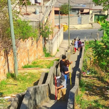 No terceiro e último dia da residência, o primeiro encontro foi realizado na Creche Tia Carminha, localizada na Ocupação Eliana Silva, com mediação da artista Gilmara Oliveira. A atividade foi inspirada no tema “Fome de quê?”, com disparadores poéticos e musicais para ativação dos corpos. Após esse momento, os participantes caminharam até o escadão próximo ao Centro Cultural Vila Santa Rita, carregando copos com água em reflexão sobre o cuidado e a falta. Em seguida, realizaram uma ação coletiva de limpeza e performance com os copos nos 89 degraus da escadaria, cada um conforme seus próprios desejos e sentidos.