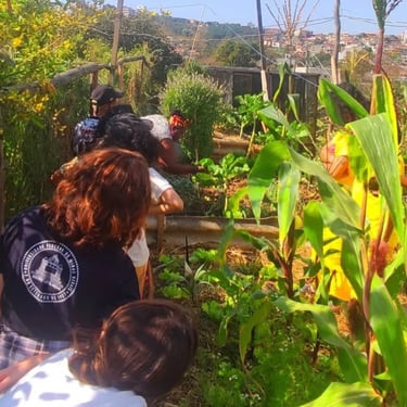 Ainda no terceiro dia, o segundo encontro foi com Alexandra, na horta coletiva da Ocupação Paulo Freire. A caminhada até o local foi seguida de uma acolhida calorosa. Alexandra compartilhou a transformação do terreno, anteriormente um bota-fora, em um espaço produtivo e sagrado, que hoje fornece alimento para o corpo e o espírito, ressaltando a importância do cuidado e da manutenção da horta.